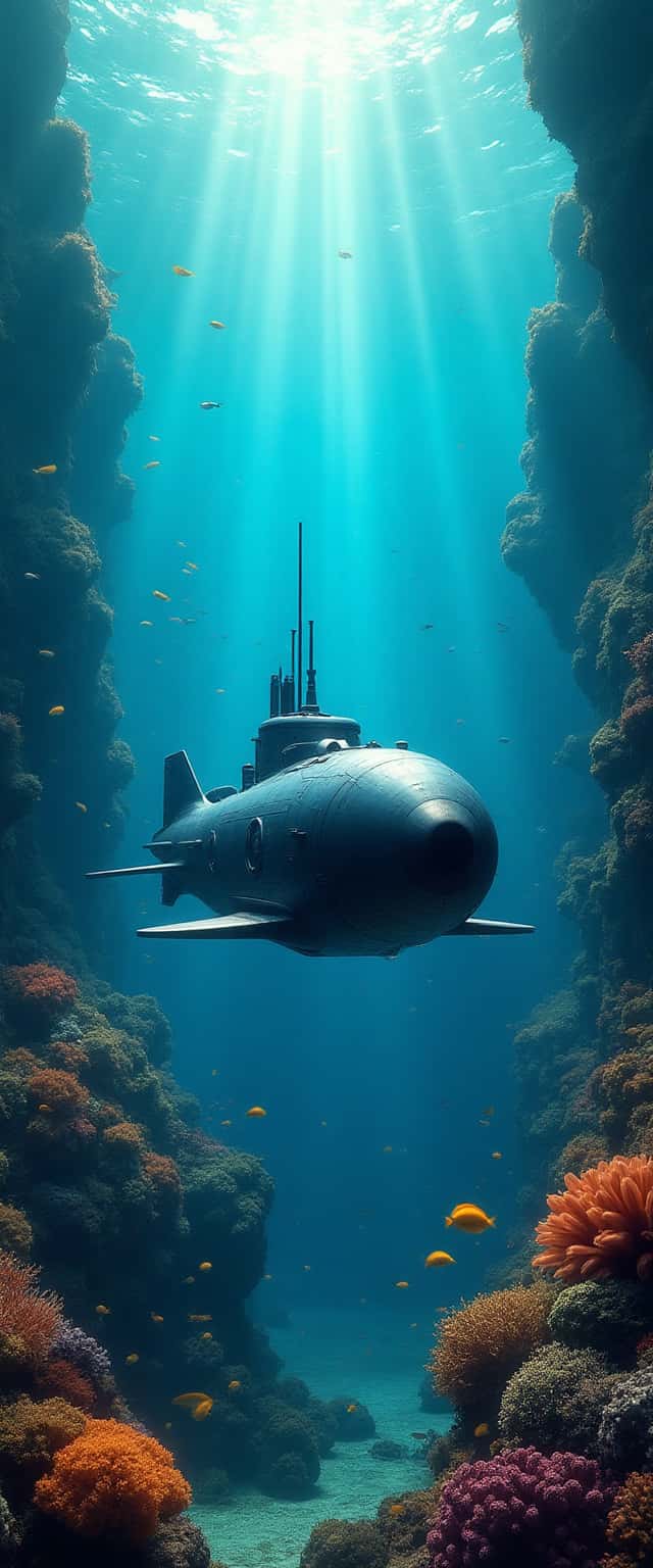 A striking underwater scene showcasing a sleek, futuristic submarine gliding through vibrant coral reefs. The deep blues and greens create a serene atmosphere, adorned with schools of colorful fish and shafts of light filtering from above, in a hyper-realistic style.