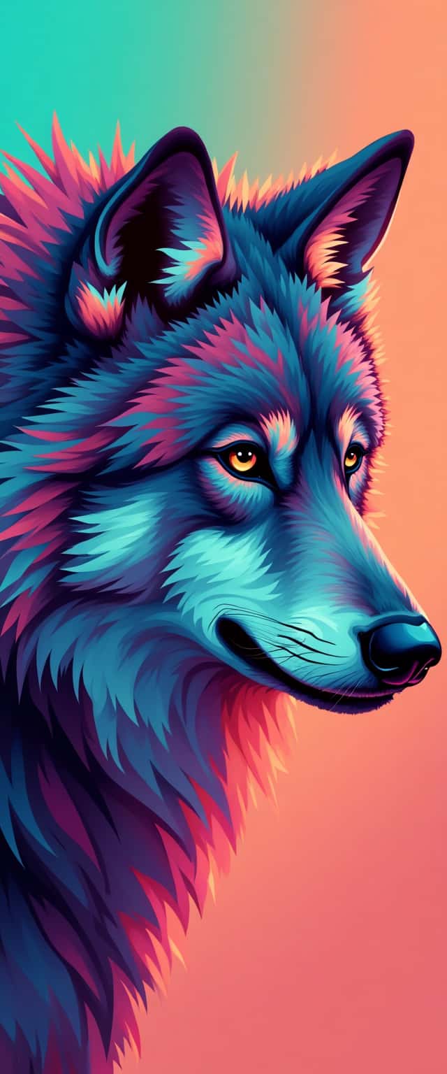 This design features a close-up of a wolf's head, crafted through a kaleidoscope lens of vibrant geometric shapes in neon colors. The sharp angles depict a fierce expression, emphasizing the animal's intense gaze. The wolf's fur is illustrated with a complex layering of colors, creating a striking sense of depth. The gradient background smoothly transitions from a vivid teal to a soft peach, enhancing the overall vibrancy and adding an artistic flair. The contrast between the geometric elements and the smooth gradient creates a captivating visual experience that draws viewers in.