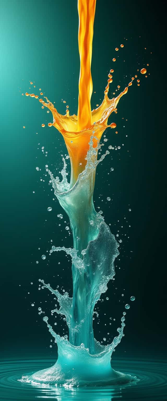 A mesmerizing design showcasing a golden liquid pouring from the top, meeting a cool teal stream from below. The clash results in intricate splash formations, all set against a smooth, deep teal surface, conveying an energetic upward flow.