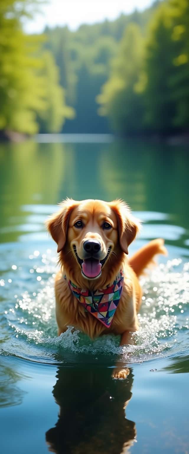 An adorable golden retriever, wearing a colorful bandana, happily splashes in a sparkling blue lake surrounded by lush green trees. Reflections of the dog ripple in the water, and soft sunlight filters through the leaves, casting a serene atmosphere.