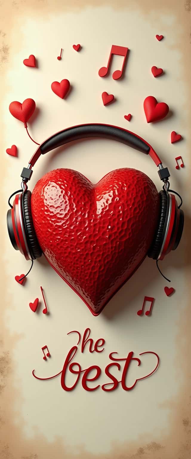 A large, vibrant heart meticulously rendered in rich, oil-red texture, adorned with intricately detailed vintage headphones. Surrounding this rustic centerpiece are small, glossy 3D hearts and floating musical notes, all set against a backdrop of antiqued mint paper printed with delicate engravings. At the bottom, the phrase 'the best' is elegantly engraved, enhancing the vintage vibe.