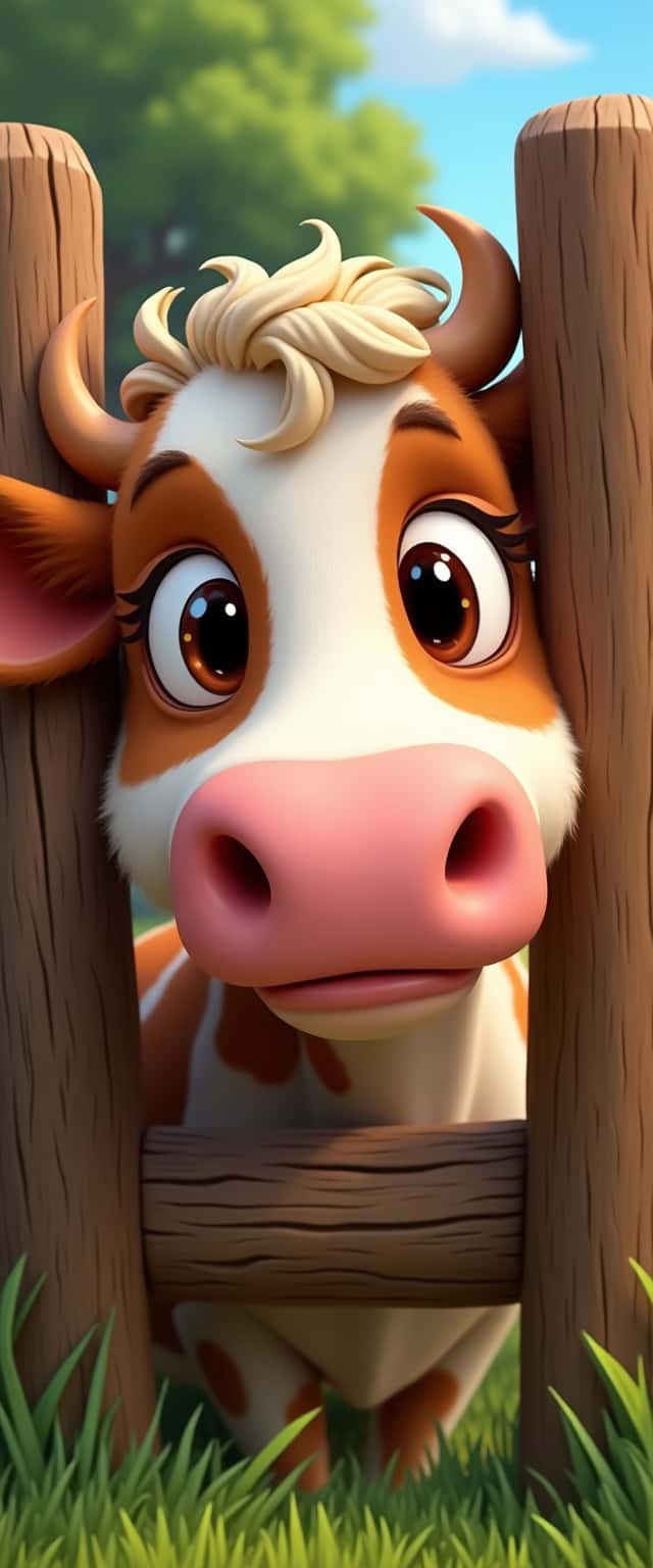 This close-up portrait features an inquisitive Holstein cow, characterized by its distinct black and white markings, peeking over a rustic wooden fence. The cow's large, expressive eyes and prominent, glistening nose draw in the viewer, contributing to a charming and inviting aesthetic. The soft textures of its patchy fur are highlighted, enhancing the cow's gentle demeanor. Surrounding the cow, the lush green grass and elements of farm life create a warm atmosphere, inviting a sense of tranquility and connection to nature. The composition emphasizes the cow's personality while celebrating rural life.