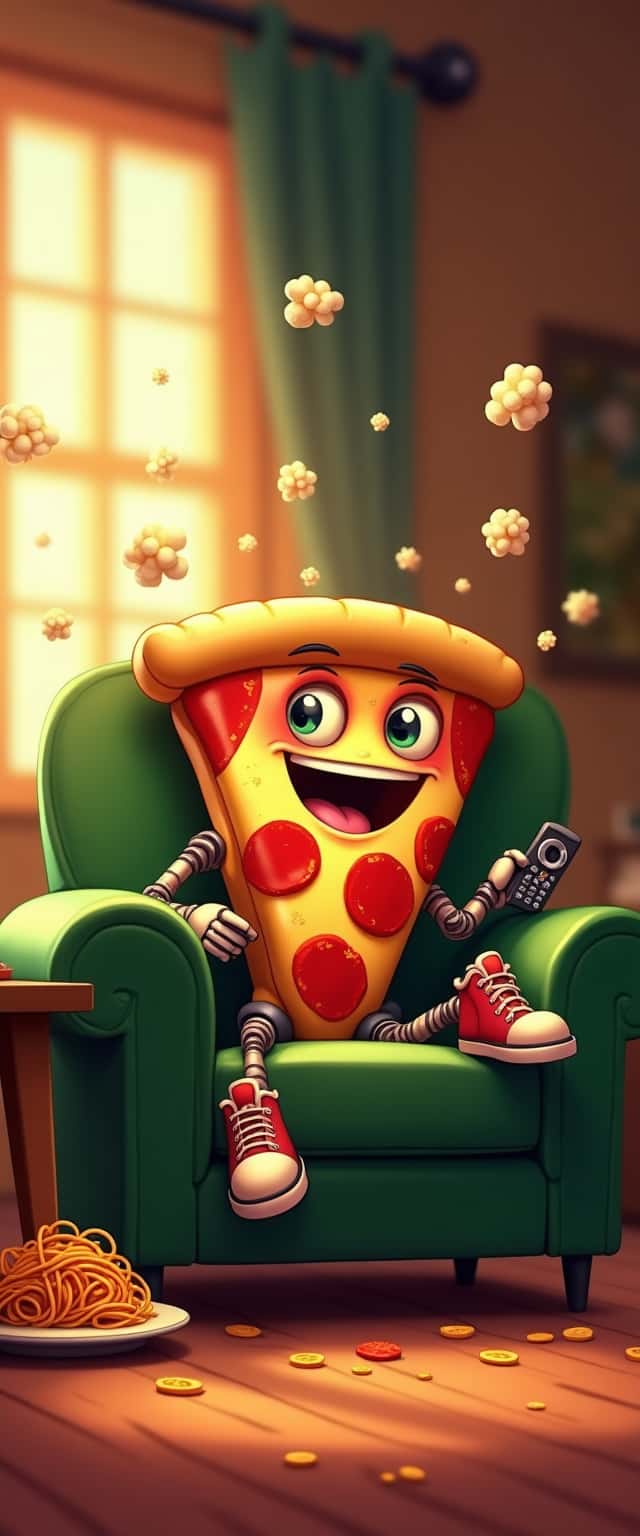 This whimsical design features a humanoid slice of pepperoni pizza, complete with vibrant colors and exaggerated features like large eyes and a cheerful grin. The pizza slice sports robotic arms and legs, adding a fun, quirky touch to the character. It lounges comfortably in a cozy green armchair, clutching a TV remote, amidst a warmly lit living room atmosphere. Floating popcorn enhances the playful scene, while a nearby table showcases a plate of tangled spaghetti, contributing to the humorous and casual vibe. The wooden floor, scattered with crumbs, perfectly encapsulates the feeling of a lived-in space where fun and relaxation meet.