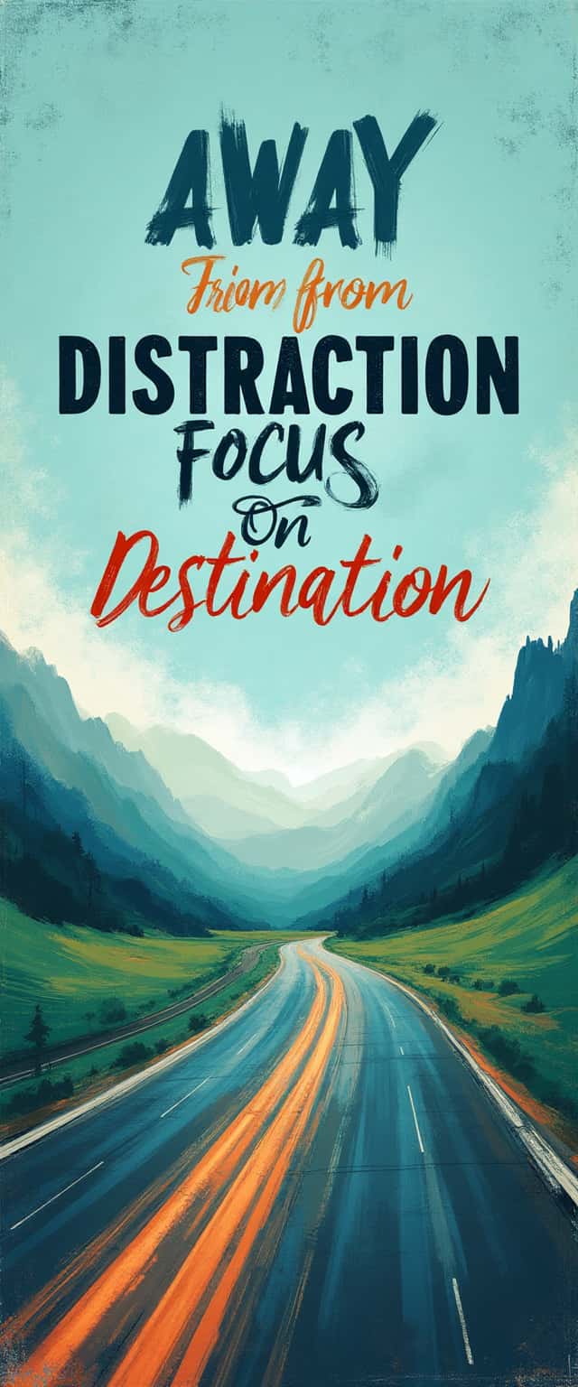 A vibrant, modern graphic with bold typography showcasing the phrases 'Away From Distraction, Focus On Destination' at the center in dynamic, large letters. The background features a serene landscape of open roads and mountains, blending calming blues and greens with textured gradients. The second text is creatively integrated at the bottom in smaller, elegant script, surrounded by subtle abstract elements that symbolize a journey.
