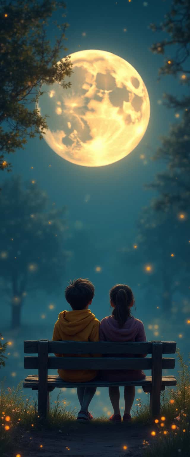 An intimate scene showcasing two friends sharing a moment on a weathered wooden bench in a park, their heads tilted back in wonder at the brilliant, oversized moon. Surrounding them are flickering fireflies and blooming night flowers, enhancing the serene ambiance.