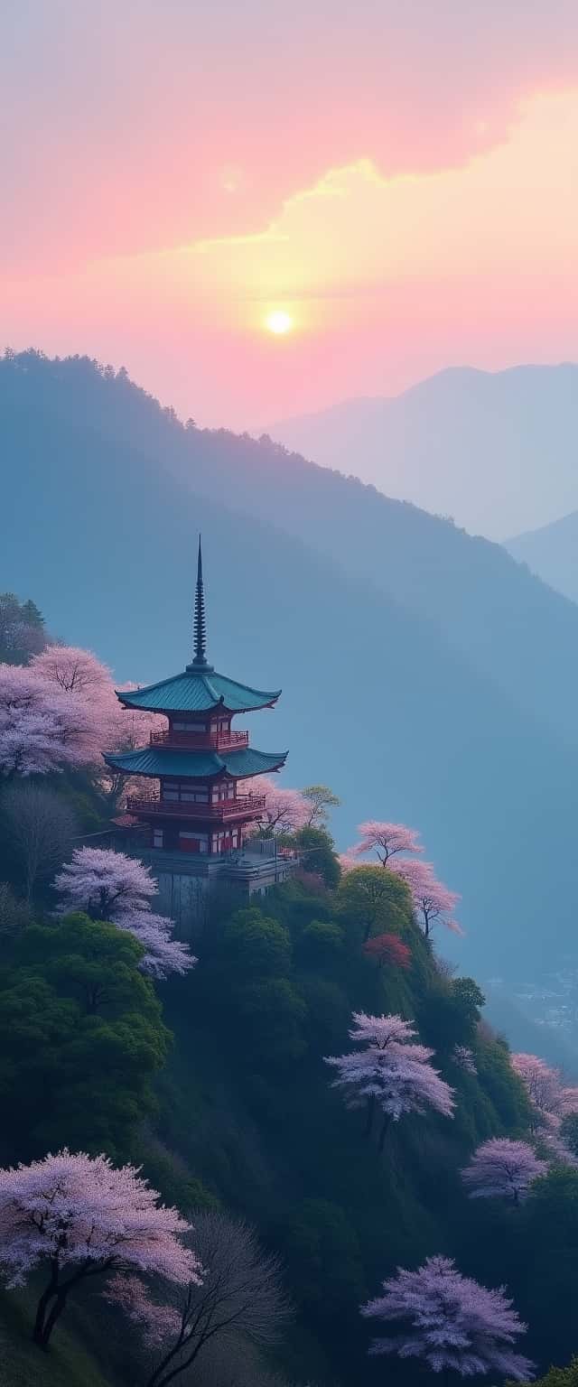 This design captures a serene Japanese mountain landscape at sunrise, showcasing traditional wooden pagodas set against a backdrop of lush greenery and blooming cherry blossom trees. The soft pastel hues of the sky transition from pink to light orange, filling the scene with a tranquil ambiance. Mist cloaks the distance, creating a dreamy silhouette of mountains that enhances the peaceful atmosphere. The pagoda's architectural elegance is accentuated by the vibrant blossoms, making it a picturesque representation of Japanese culture and natural beauty.