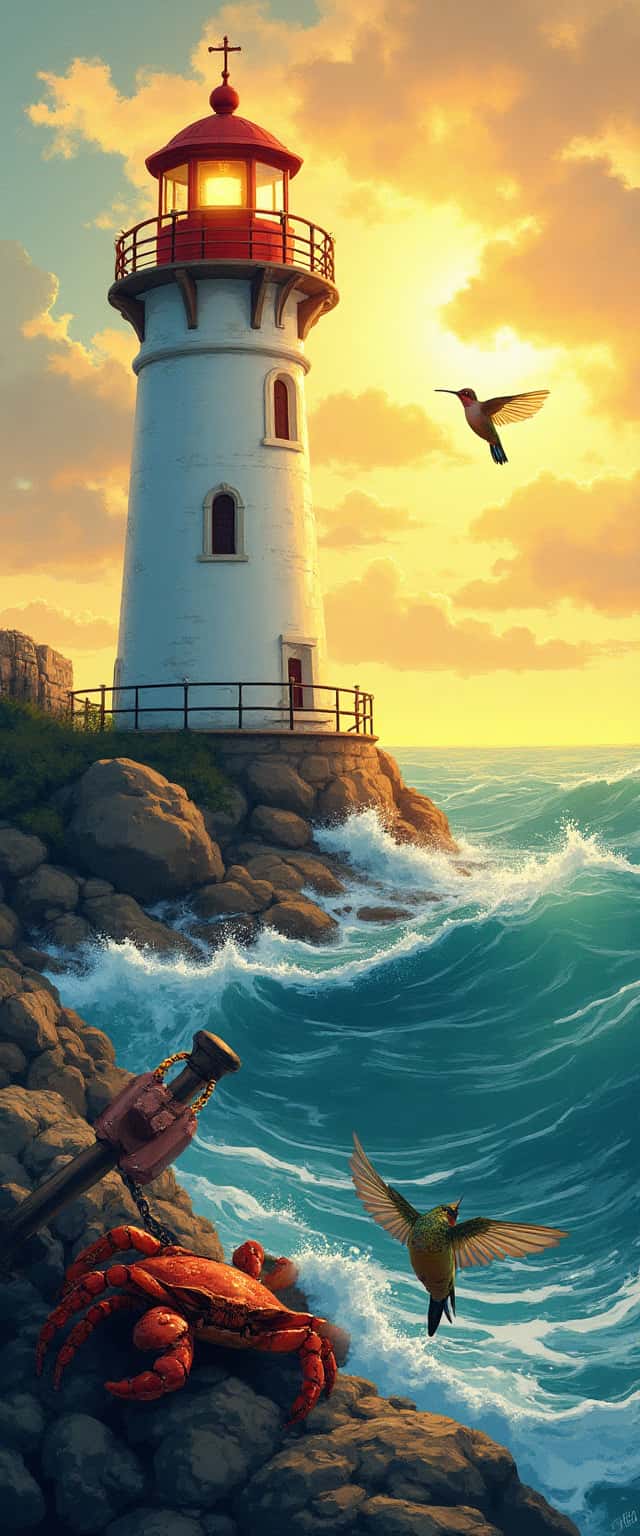 A close-up, illustration of a lighthouse bathed in golden sunlight, surrounded by a swirling sea. A curious crab peeks from behind a barnacle-encrusted boat anchor. A hummingbird darts in, its iridescent feathers catching the light, all in a bold, graphic style.
