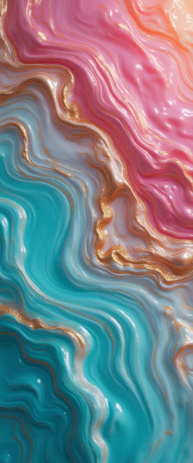 This design features a close-up view of liquid patterns that resemble cascading waves. The vibrant blend of turquoise, pink, and gold creates an eye-catching visual with a glossy, reflective texture akin to liquid mercury. The fluidity of the colors draws the viewer in, with each layer intricately merging to form a mesmerizing depth. Subtle gold accents add a hint of luxury, enhancing the retro vibe of the design while evoking a sense of hypnotic movement. The overall effect is bright and captivating, ideal for a range of applications from phone cases to digital wallpapers.
