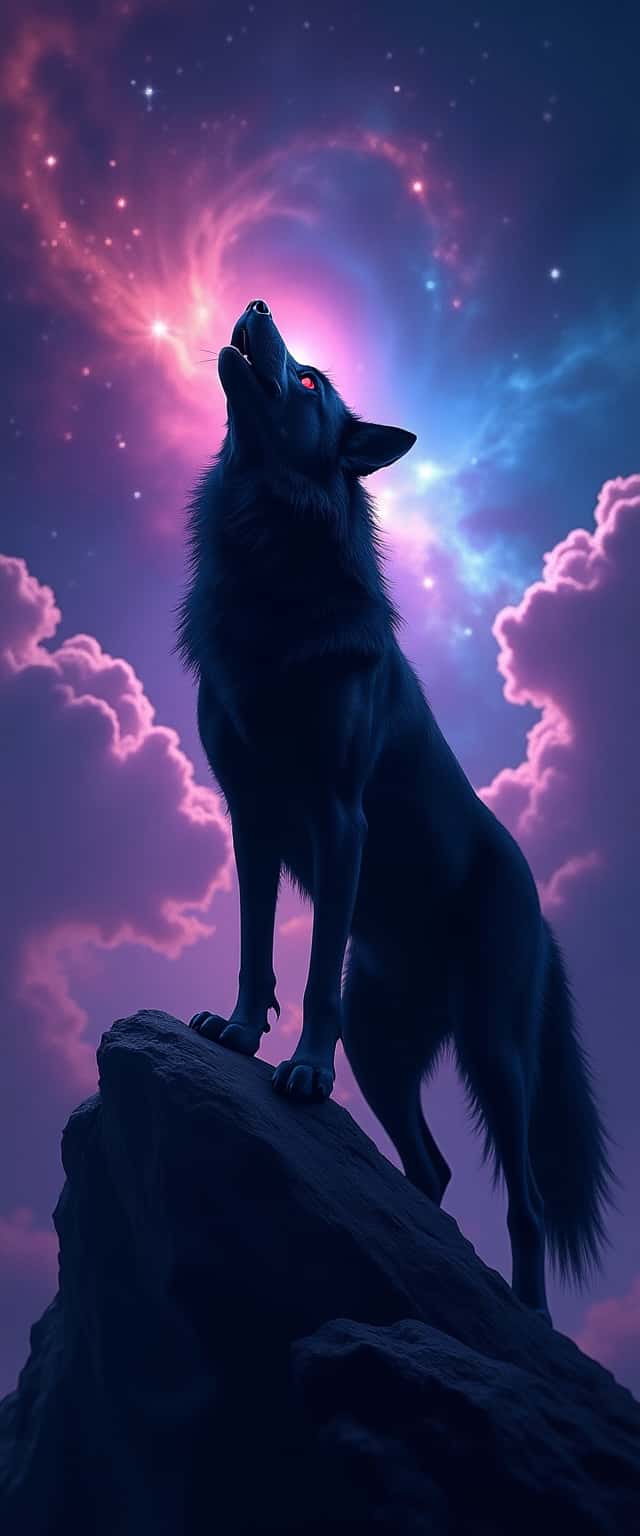 A striking black wolf stands majestically on a rocky precipice, its piercing red eyes glowing against a swirling galaxy of vibrant purples, blues, and twinkling stars, with cosmic clouds swirling around in an ethereal dance, creating a dramatic, otherworldly scene.