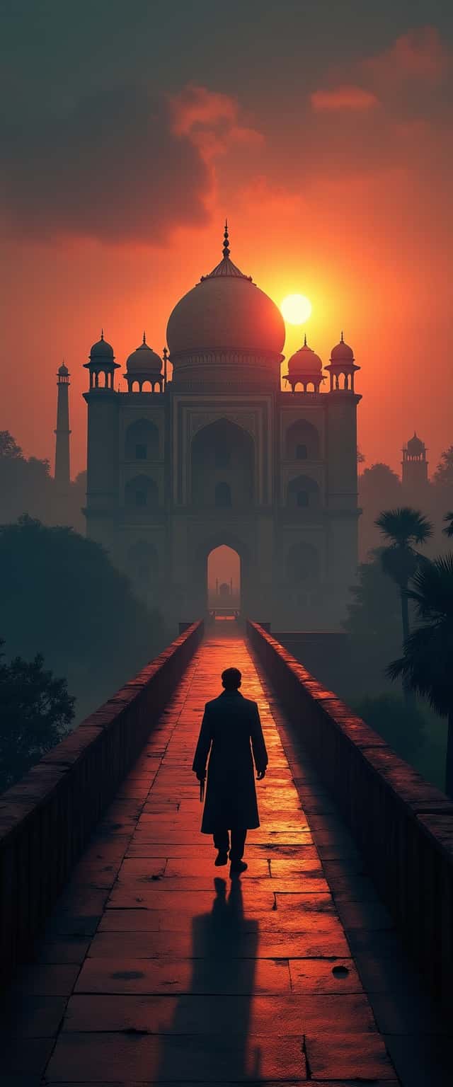 This design depicts a grand ancient palace, showcasing its majestic silhouette against a dramatic twilight backdrop. The scene is imbued with a mystical ambiance, where the fading grandeur of the architecture contrasts beautifully with the deep tones of the setting sun. In the foreground, a solitary figure resembling an emperor strides confidently across a bridge, creating a powerful visual narrative. The bold words 'I am Khan' overlay the palace, establishing a striking juxtaposition of strength and elegance. The warm hues of orange and cool shadows enhance the ethereal quality of the scene, inviting viewers to imagine the stories held within the palace's walls.