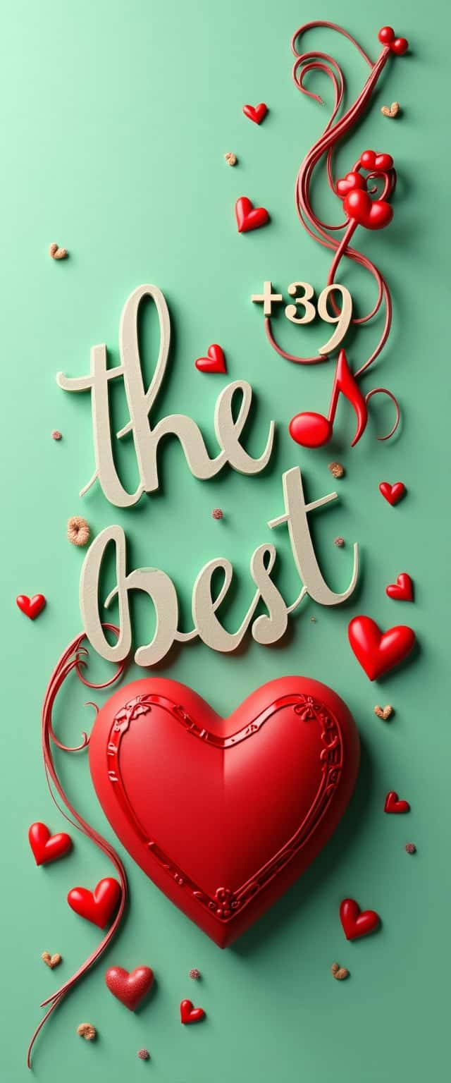 This design features a mint green textured paper background that provides a fresh and vibrant setting. In the foreground, a stylized, slightly off-center deep red heart captures attention, intricately detailed with embellishments. Modern headphones dangle in a relaxed manner, signifying a connection to music. Surrounding the heart are tiny 3D hearts and vintage musical notes creating a playful atmosphere of joy and energy. The phrase 'the best' is elegantly engraved into the heart, while '+39' flows effortlessly around, enhancing the design's artistic flair. This composition beautifully combines love, music, and modern aesthetics in a charming and whimsical way.