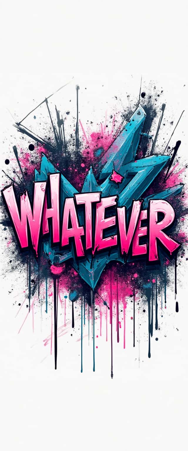 The word 'Whatever' is illustrated in an eye-catching graffiti font, embellished with drips and splashes of neon pinks and blues. Textured geometric shapes and graffiti-inspired doodles swirl around it, capturing the essence of urban expression and creativity.