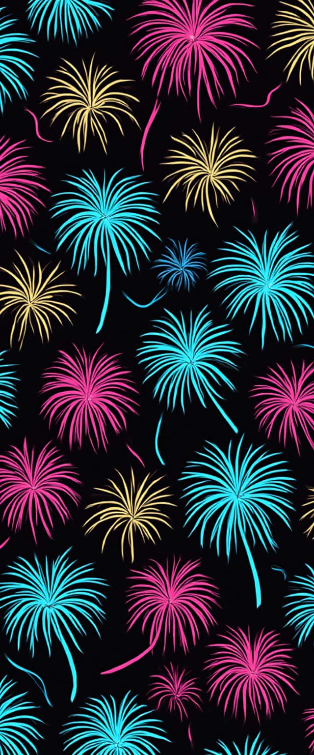 This design features an intricate, repeating pattern of palm trees interwoven with dynamic firework graphics. The vivid neon colors—electric blue, vivid pink, and bright yellow—create a striking contrast against a solid black background, enhancing the lively aesthetic. Each firework graphic is uniquely designed, lending an energetic movement to the overall composition. The palm trees, illustrated in vibrant shades, echo the celebratory theme introduced by the fireworks, giving the design a festive and tropical feel that is both playful and engaging.