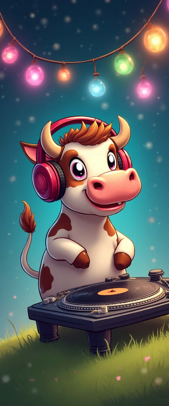 This whimsical design features a cartoon cow wearing oversized headphones, exuding an aura of fun and energy. Positioned at sleek turntables, the cow joyfully engages in music mixing, with vibrant vinyl records prominently displayed. The design is illuminated by colorful string lights that hang overhead, casting a festive atmosphere. The background is a mesmerizing starry night sky, creating a contrast with the soft grasses that rustle around the cow's hooves. The cow's mischievous grin and expressive eyes add a delightful touch, enhancing the playful theme of the artwork and inviting viewers to join in the musical celebration.