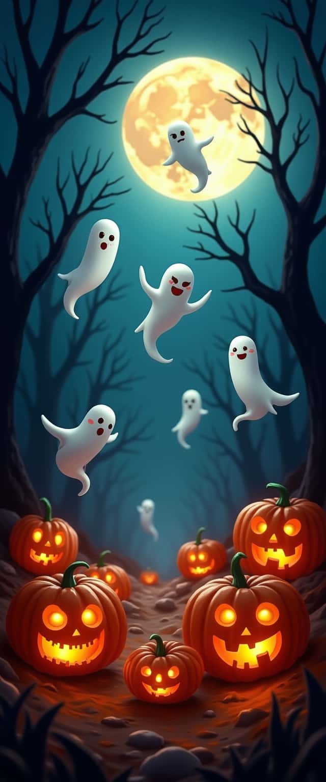 A vibrant Halloween scene featuring playful ghosts swirling around in a moonlit night sky, surrounded by glowing jack-o'-lanterns of various sizes. The background is a dark, spooky forest with silhouetted trees, and a glowing full moon illuminating the eerie atmosphere.