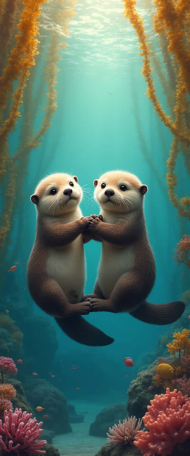 This design captures an enchanting underwater scene featuring two adorable sea otters floating on their backs among a vibrant kelp forest. Sunlight filters down through the crystalline water, casting a warm glow on the scene and illuminating the rich textures of the kelp and colorful coral below. The otters, with their expressive faces, engage in playfulness, holding hands and cracking open shells, adding to the whimsical charm of the image. Surrounding them are small fish darting in and around the beautiful coral formations, enhancing the lively ecosystem. The combination of warm colors and the gentle movement of the water creates an inviting atmosphere that evokes a sense of joy and tranquility.