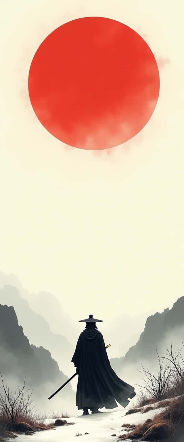 In a minimalist composition, a samurai clad in flowing attire stands defiantly above a vast snowy landscape, their dark figure contrasted sharply against an enormous radiant red sun, intricate ink wash details whispering through the misty hills.