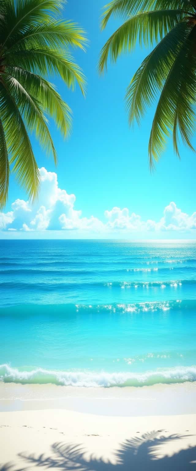A vivid landscape capturing a serene blue ocean under a clear azure sky, framed by lush green palm trees swaying gently in the breeze. The rippling waves reflect sunlight, creating sparkling diamonds across the water's surface, with soft white sand in the foreground.