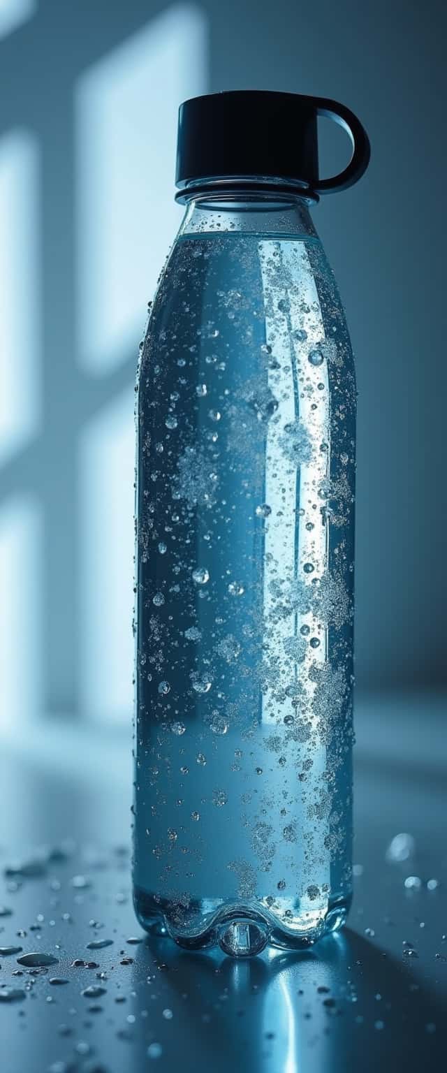 This close-up portrait features a stylish water bottle with a sleek design. The bottle, slightly angled, showcases a clear surface where droplets of water glisten under bright lighting. The cap is slightly open, suggesting readiness for use. The modern backdrop enhances its elegance, while the play of light creates a sparkling effect on the water inside the bottle. The overall composition emphasizes cleanliness and sophistication, making it a perfect representation of modern hydration solutions.