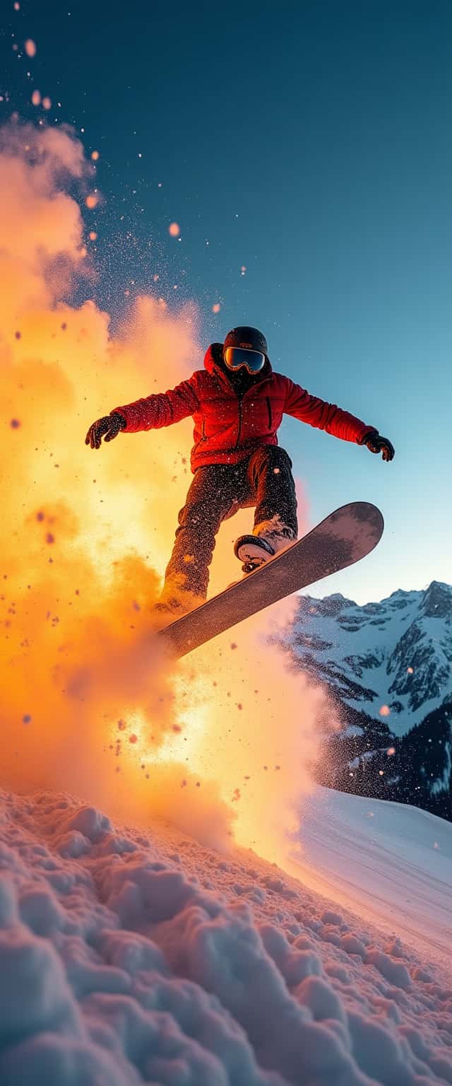 This dynamic scene captures a snowboarder soaring through the air, expertly balancing on their snowboard amidst a powerful explosion of fiery flames and swirling snowflakes. The vivid hues of orange and yellow flames contrast with the bright blue sky, creating a striking visual effect. The rugged mountain range in the background adds depth and drama, while the attention to detail emphasizes the snow particles and the vigorous movement, evoking a sense of exhilaration and adrenaline. The snowboarder's vibrant red outfit adds an energetic pop against the cooler tones of the landscape, making this design not only visually engaging but also thrilling.