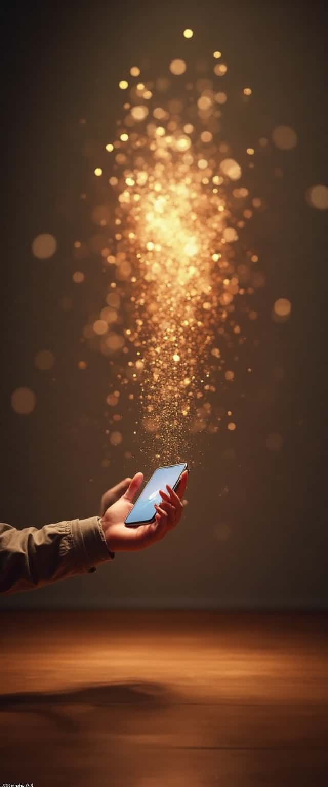 This design captures a sophisticated art space where a manicured hand holds a sleek smartphone, seamlessly interacting with radiant AR jazz instruments. The background features warm particle effects that create a dynamic ambiance. The bokeh-lit gallery floor adds depth and invites exploration, emphasizing creativity and modern technology in a refined artistic environment. The focus on the delicate hand and the smartphone draws attention to the tactile relationship between art and technology, with shimmering particles suggesting a magical experience.
