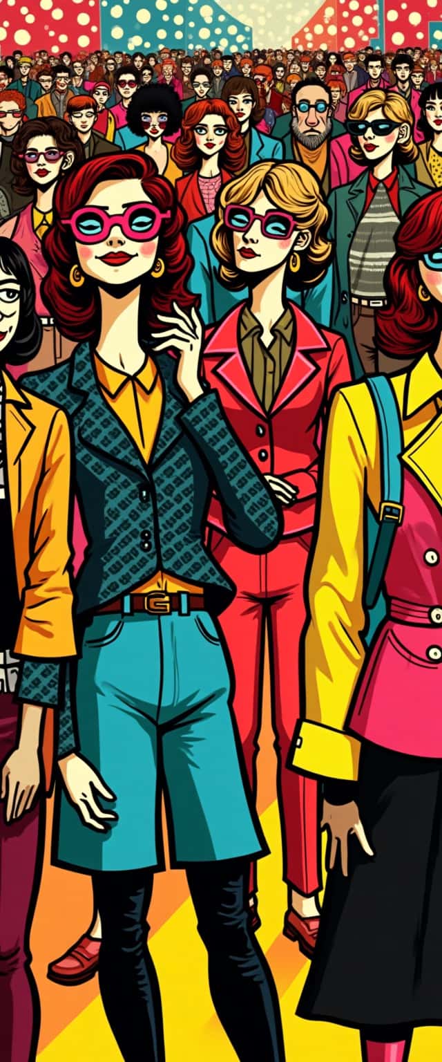 This design features a vibrant repeating pattern of stylized food items like oversized burgers and eye-catching cupcakes. Rendered in a dynamic pop art style, the artwork showcases each item with bold, saturated colors and distinct black outlines. The colorful food elements are set against a playful polka dot background, creating a visually stimulating juxtaposition. The overall effect is cheerful and lively, perfect for attracting attention and conveying a sense of fun. This design could be applied to various products, making it suitable for everything from kitchen accessories to fashion items.
