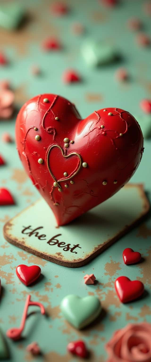 This design features a central bold heart crafted in a luxurious oil red, enhanced with intricate details and adorned with vintage headphones symbolizing musical passion. Surrounding the heart are small, vibrant 3D hearts and dynamic musical notes, creating a lively ambiance. The background is a textured mint paper, adding a soothing contrast against the bold red. At the base, the elegantly engraved inscription 'The Best' adds a personal touch, suggesting a celebration of love and music, making this piece a perfect fit for various applications such as greeting cards, relationship-themed gifts, or music-related merchandise.