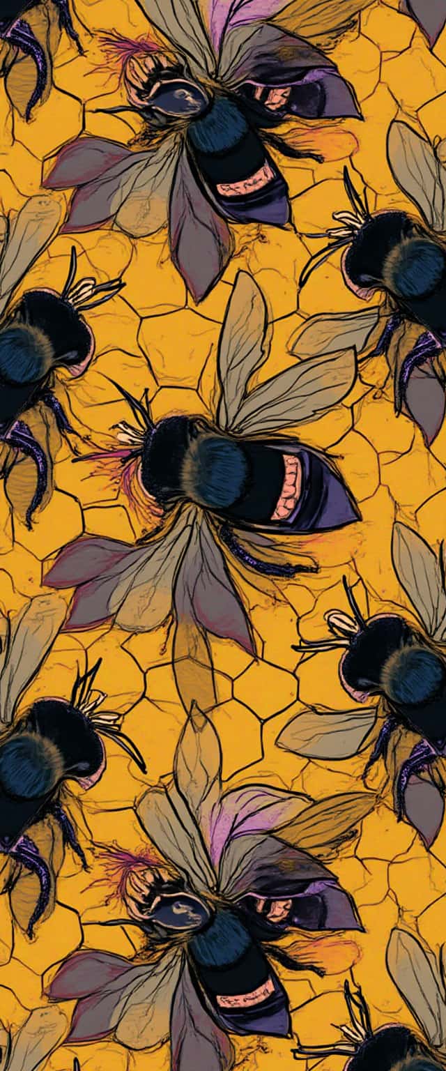 This design features a striking repeating pattern of stylized queen bees, each adorned with unique crown designs. The bees are set against a vibrant honeycomb backdrop, characterized by a rich palette of bold colors, including deep yellows, rich blacks, and accents of royal purple. The abstract depiction of honeycomb structures creates a dynamic interaction with the bees, giving a sense of movement and liveliness. The intricate details of the bees, especially their crowns and colorful wings, contrast with the geometric honeycomb pattern, making this design visually captivating and engaging.