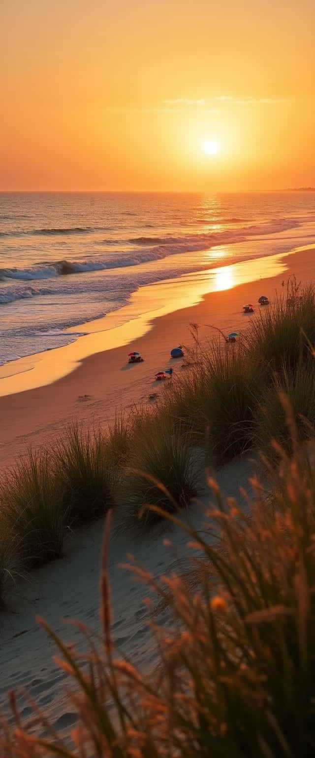 This design captures a tranquil sunset scene over Dębki Beach in Poland. The horizon is painted in warm golden and orange hues as the sun sets, casting a reflective glow on the gentle waves lapping against the shore. The soft golden sand is interspersed with colorful beach umbrellas, providing a cheerful contrast against the vivid sunset. Silhouetted dunes covered with beach grass frame the scene, enhancing the feeling of serenity and solitude. The overall composition evokes a calming coastal ambiance, perfect for those seeking relaxation or a visual escape to nature's beauty.