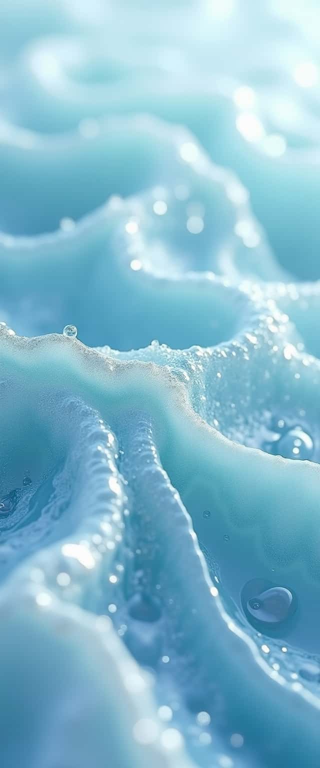 This close-up image captures a mesmerizing liquid composition that resembles smooth ocean waves. The palette features soothing shades of teal, pale blue, and aqua, creating a calming effect that evokes tranquility. The texture showcases fluid, undulating waves with soft curves and gentle ridges, effectively merging the vibrant hues. The absence of bubbles and droplets allows the focus to remain on the intricate wave patterns, enhancing the overall depth and fluidity of the scene. The light catches on the surfaces, further emphasizing the dynamic interplay of colors and textures.