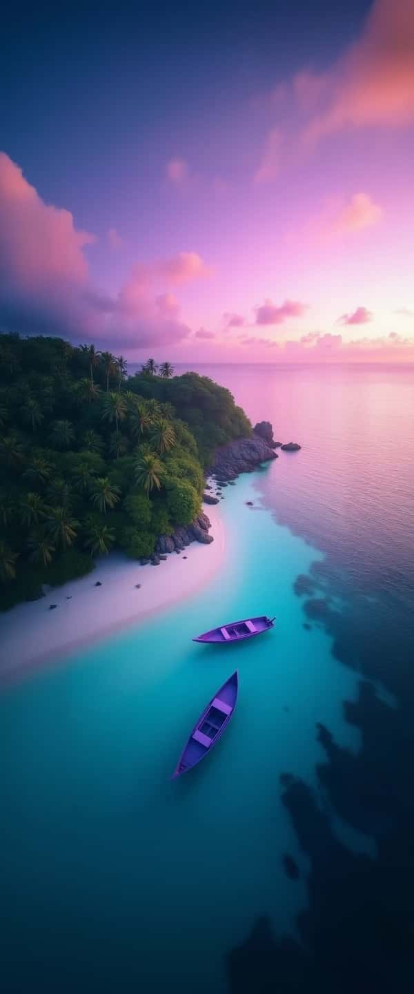 This aerial view captures the tranquil essence of a tropical beach at sunset. The vibrant purple-pink sky seamlessly merges into the calm turquoise and violet hues of the ocean. A lush green island provides a verdant backdrop to the pristine white sand beach. Two sleek purple boats linger in the shallow, crystal-clear waters, adding a contemporary touch to the idyllic scene. The combination of colors evokes a dreamlike atmosphere, creating a serene escape that invites relaxation and contemplation.