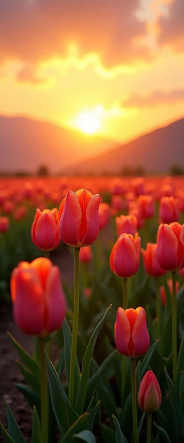 This design features a tranquil landscape dominated by a vivid field of tulips in varying shades of pink and orange, set against a spectacular golden sunset. The flowers display detailed textures and graceful forms, swaying gently with the breeze. Above, the sky is a blend of warm hues, seamlessly transitioning from orange to soft pink, while distant mountains add depth and serenity to the scene. The focus is on the vibrant tulips in the foreground, capturing the essence of a peaceful evening. The overall composition evokes feelings of calmness and natural beauty, making it an ideal choice for those seeking a soothing visual experience.