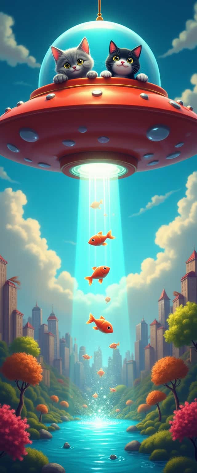 This enchanting design features a sleek UFO hovering above a twinkling body of water at twilight. Two adorable cats, a gray tabby and a tuxedo, peer excitedly out of a glowing window as a tractor beam extends downward, lifting vibrant fish from the water. The surrounding scene is lively with colorful trees and city skyline in the background, balanced by a sparkling starry sky. The fusion of playful elements—endearing cats, whimsical UFO, and animated fish—creates a visually captivating narrative that evokes wonder and imagination.