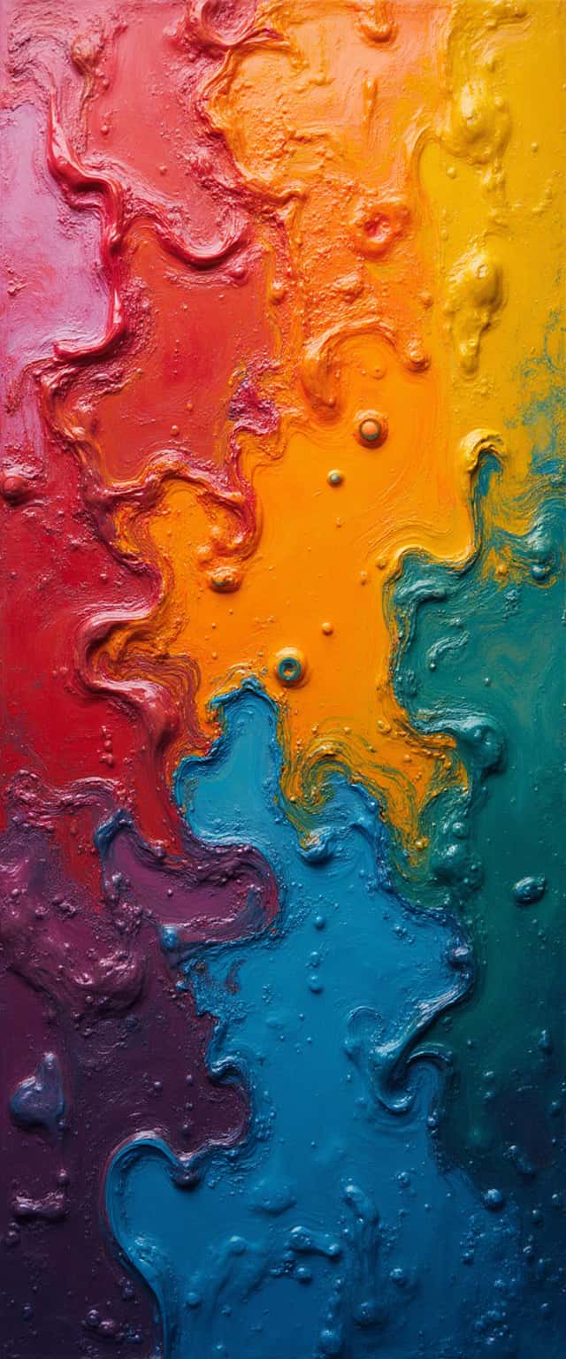 A vibrant abstract scene showcasing cascading wet paint in a rainbow of colors, swirling and mixing together on a textured canvas. Bold, fluid shapes create a dynamic flow, with droplets glistening like gems under bright studio lights.