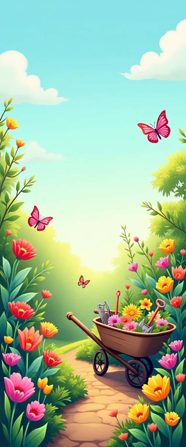 A vibrant, lush garden scene featuring colorful flowers in full bloom, with butterflies fluttering around and a charming wheelbarrow filled with gardening tools, all set against a soft, sunny blue sky. The art style is a cheerful illustration, highlighting the beauty of nature.