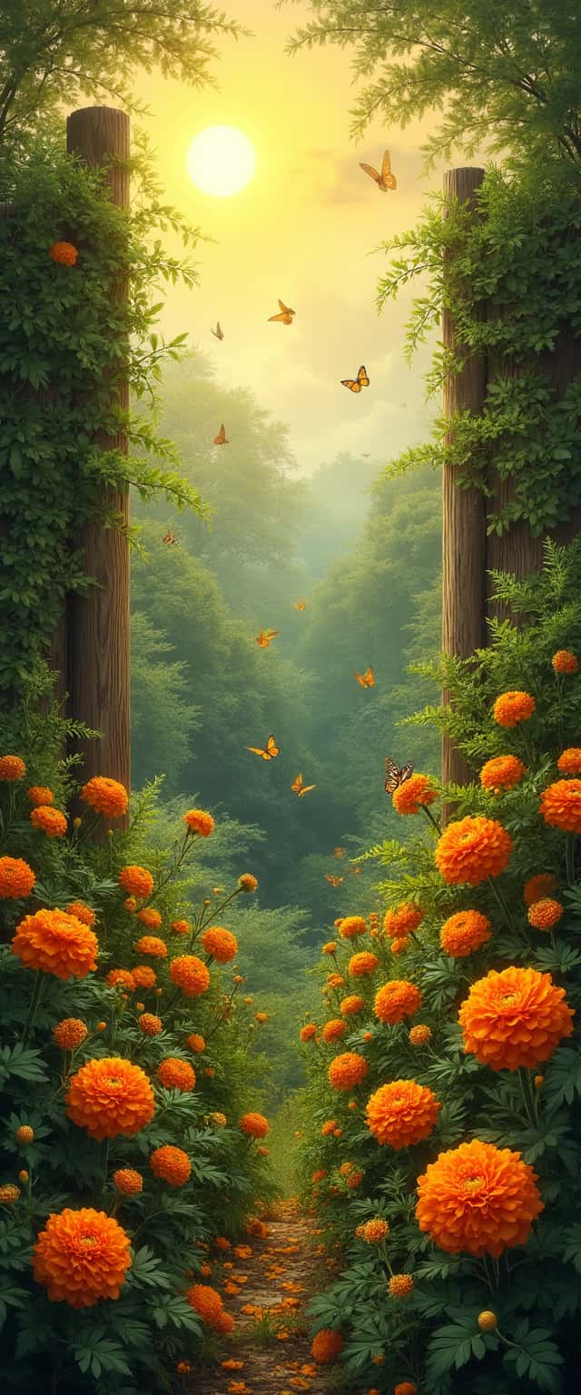 This design showcases a breathtaking garden filled with vibrant orange marigolds and rich green ferns, creating a lush and inviting atmosphere. The scene is illuminated by a radiant sun, casting a warm glow over the petals. Leafy vines elegantly wrap around rustic wooden fences, adding to the natural charm. Butterflies flit about, enhancing the lively ambiance and drawing attention to the intricate details of the flora. A tranquil pathway paved with petals leads deeper into the garden, fostering a sense of adventure and exploration.