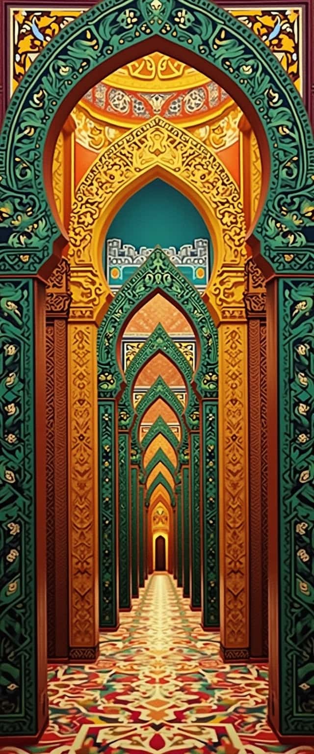 This design features a stunning collage inspired by the famous Macca architecture, melding intricate patterns drawn from traditional Madina art. The structural elements are accentuated with rich golds, deep browns, and bright greens, creating a visually captivating and immersive scene. The layered arches and ornate decorations evoke a sense of depth and cultural richness, inviting viewers to explore the harmonious fusion of both architectural styles. The flooring, adorned with vibrant patterns, adds an additional layer of complexity and beauty, making this design not only a tribute to heritage but also a modern artistic expression.