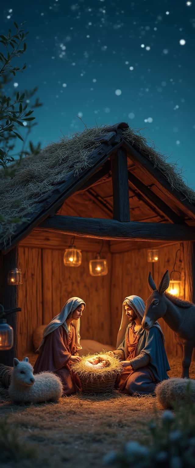This design captures a heartfelt nativity scene set in a rustic stable illuminated by soft, golden light. Mary and Joseph sit attentively beside the newborn Jesus in a woven basket, creating an intimate atmosphere. The scene is rich in detail, featuring delicate farm animals such as a sheep and a donkey, contributing to the pastoral setting. The stable, constructed from dark wood, is adorned with straw on the roof, while lanterns cast a warm glow. Above, a starry night sky completes the serene landscape, enhancing the overall sense of peace and reverence inherent in the nativity theme. The effective use of lighting and soft color palette conveys warmth and tenderness, making it ideal for seasonal decor or as a centerpiece in Christmas-themed designs.
