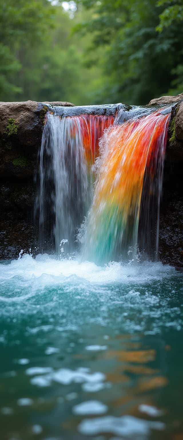 An eye-catching close-up focused on the waterfall's vibrant colors as they splash against the rocks. Each drop captures the hues of the rainbow, with vivid reds and oranges mixing seamlessly into soft greens and blues. The backdrop of dense foliage enhances the fresh, natural beauty of the scene.