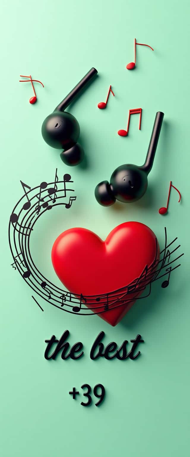 This polished 3D render features a pair of sleek black wireless earbuds positioned centrally on a nuanced mint green paper background. Surrounding the earbuds is a bold, solid black musical staff, entwined with vibrant, glossy red musical notes that emanate a playful vibe. Below the earbuds, a striking 3D red heart cradles the elegant, curved text 'the best', encapsulating a sense of passion and affection. Additionally, a small, refined engraving of '+39' is meticulously crafted into the mint paper, adding depth and sophistication to the overall composition. The design uniquely combines elements of music, love, and modern technology, making it visually appealing and engaging.