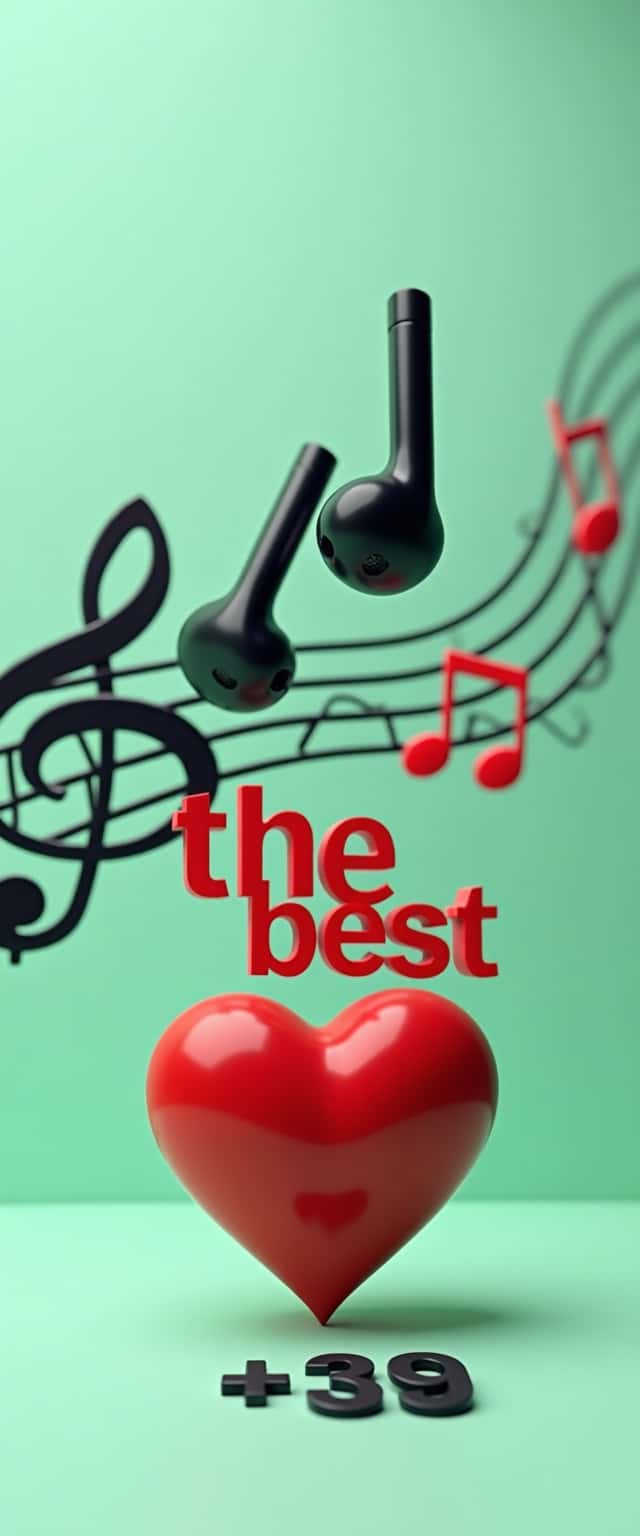 A stunning 3D graphic scene featuring a pair of sleek black wireless earbuds, suspended in vibrant mint green bokeh paper. A bold black musical staff gracefully winds around them, adorned with floating 3D red notes. Below, a bright 3D red heart showcases the words 'the best' in stylish lettering, with a delicate '+39' engraving nestled beneath it, all enhanced by crisp studio lighting.