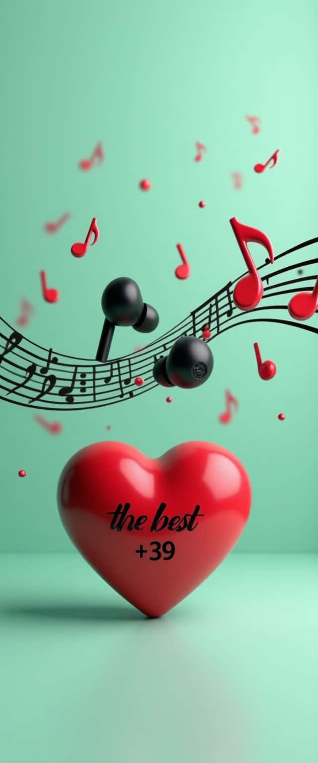 This design features a sleek black pair of wireless earbuds elegantly suspended against a soothing mint green background. They are intertwined with a dynamic black musical staff adorned with radiant 3D red notes, creating a lively musical theme. Below this captivating composition lies a vibrant red heart, prominently displaying the phrase 'the best' in bold, stylish 3D text. The heart further enhances the design with a clear '+39' engraved beneath it, adding depth and detail. The juxtaposition of the calming mint background, striking red elements, and sleek black earbuds creates a visually appealing balance, appealing to music lovers and those who appreciate modern design elements.