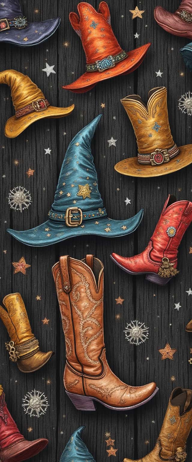 This design features an enchanting and surreal pattern combining overflowing witch hats adorned with stars and mystical symbols beside quirky cowboy boots in a range of vibrant colors. The rustic barn wood background adds a cozy, Western ambiance, enhancing the whimsical theme of the piece. The hats, with elements like golden stars and decorative belts, offer a magical allure, while the boots showcase intricate stitching and embellishments, reflecting a rich culture. The overall visual interplay creates a unique fusion of Halloween and Western aesthetics, making it suitable for various applications, from textiles to home decor.